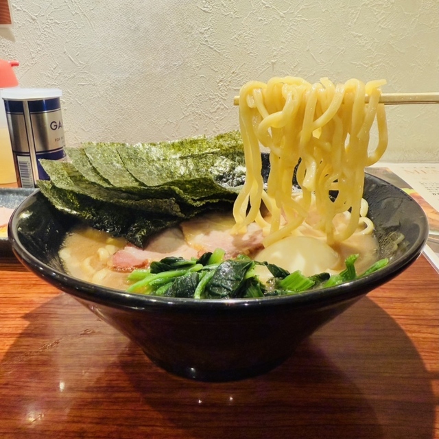 家系ラーメンとナチュールワインのマリアージュが楽しめる新店。豚骨醤油ラーメンは濃厚クリーミーで鶏油がガツンと感じられるスープと平打ち中太麺が合わさった一杯。ワインの種類も赤白スパークリングと様々です。